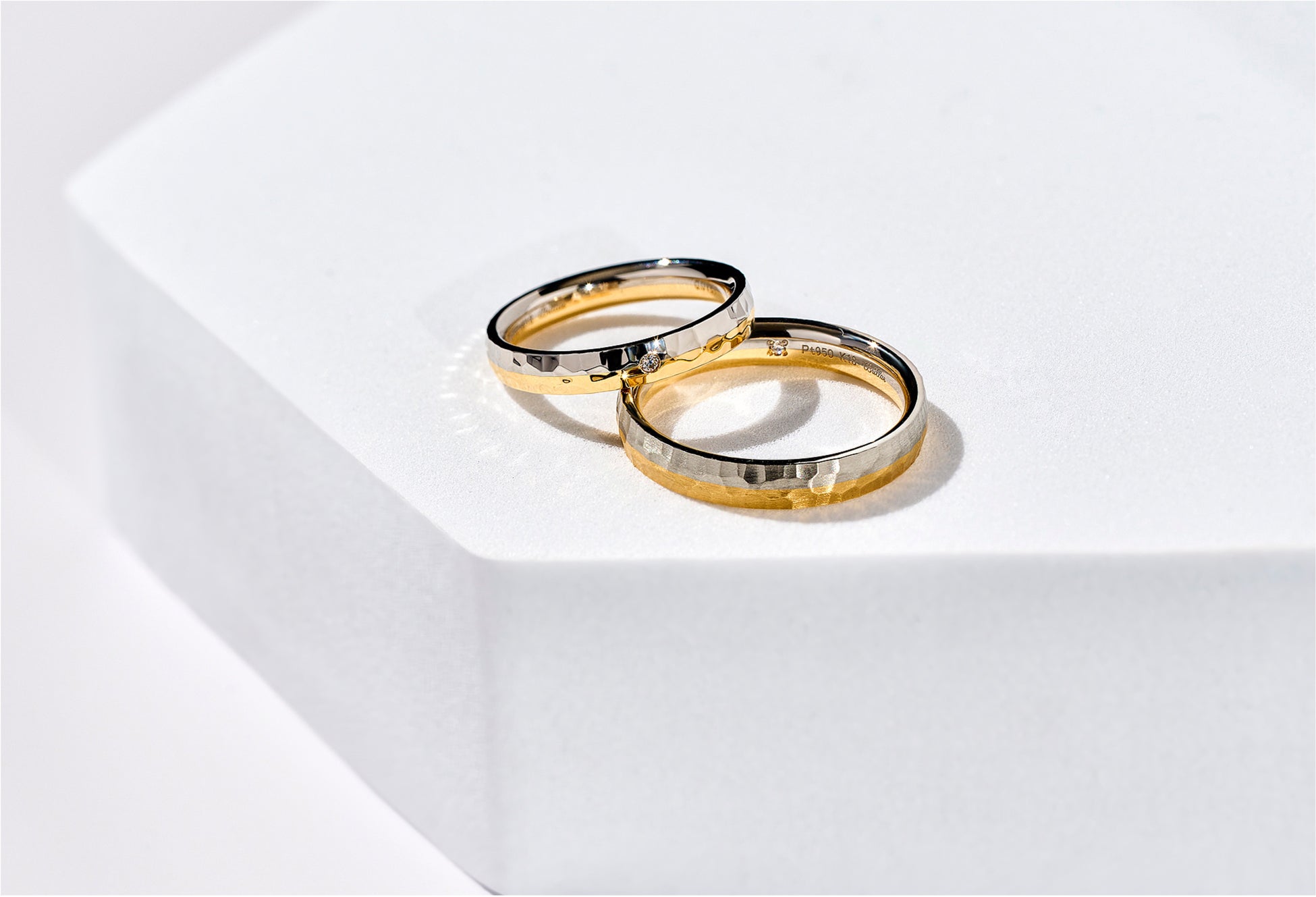 鍛造とはリングの製造方法の一つで、金属を叩いたり伸ばしたり鍛えながらリングを成型する製法です。強度や硬度に優れており、衝撃に強く傷が付きにくいのが特徴で、表⾯硬度が⾼い為、研磨したときにつやつやとした輝きを放つのも⼤きな魅⼒です。