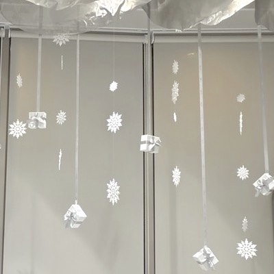 ショーウィンドウには、クリスマスプレゼントを思わせる巨大なシルバーリボンをあしらい、まるで店舗全体がひとつのギフトボックスになったかのような特別な装いに。店内には、雪の結晶や小さなギフトボックスが浮かぶ幻想的な空間が広がり、ホリデーシーズンにふさわしい上質な空間でお客様をお迎えします。
